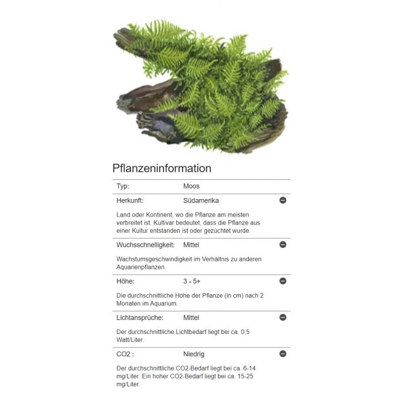 | Verwendung | Bepflanzung von Deko, Wurzeln und Steinen sowie Rückwänden und Moosdomes im Vordergrund |